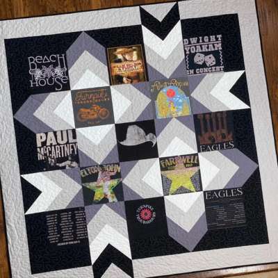 Thanks to Tina, we now have a ridiculously soft quilt that holds memories of concerts my husband and I have been to together. I wanted to get it for him for his birthday at the end of July and she worked tirelessly …